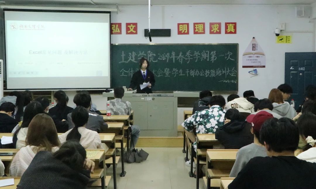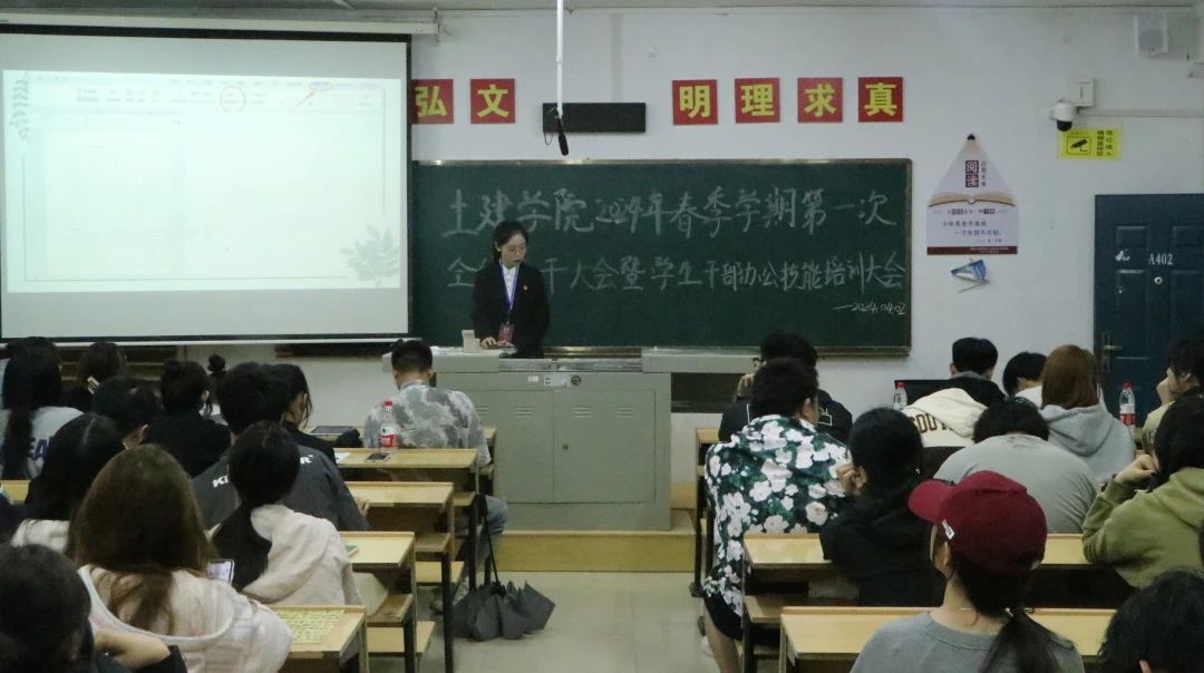 为进一步推进学生工作向前发展,明确新学期工作部署,提升学生干部办公技能,4月2日中午,土建学院于土建楼A402召开了土建学院2024年春季学期第一次全体院干大会暨学生干部办公技能培训大会,土建学院学工办主任黄思清老师、团总支书记罗泽元老师出席本次会议,学院团学自律会全体学生干部参加本次会议,此外我们还邀请到校学生会办公室张璐瑶、谭红霞和章斯璐同学参加此次会议,本次会议由宿管部王礼东和易涵同学主持。