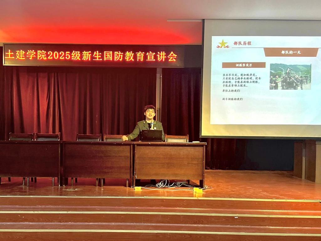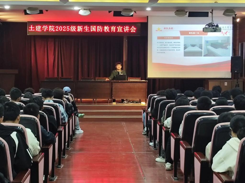 为响应国家国防建设号召,强化大学生国防观念,促进大学生全面发展,11月2日晚,土建学院于东校区第一实验楼五楼报告厅顺利召开2025级国防教育宣讲会。学院学工办罗泽元老师出席了本次会议,25级全体学生参加了本次会议。此次会议特邀机械工程学院退役军人邓旭同学主讲。