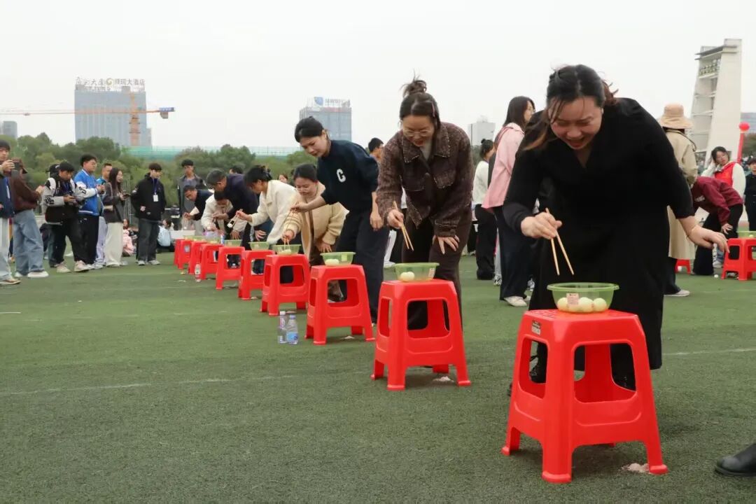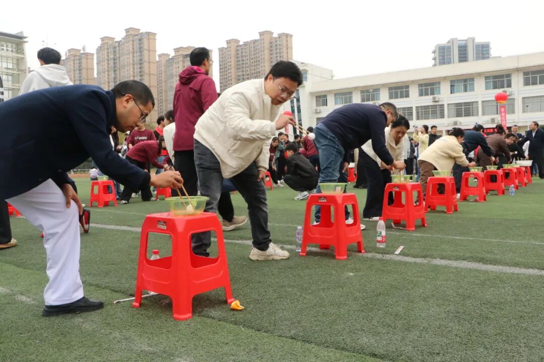 纤细的筷子考验着老师们的耐心与手眼协调。大家屏息凝神,小心翼翼夹起乒乓球,在传递过程中稳扎稳打,哪怕偶尔失误也迅速调整,用默契与专注完成每一次交接。