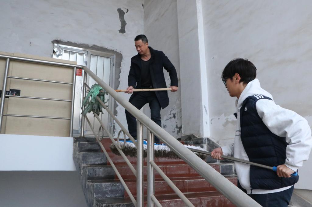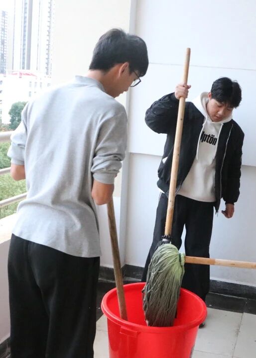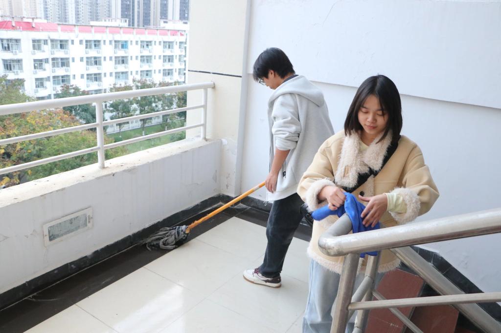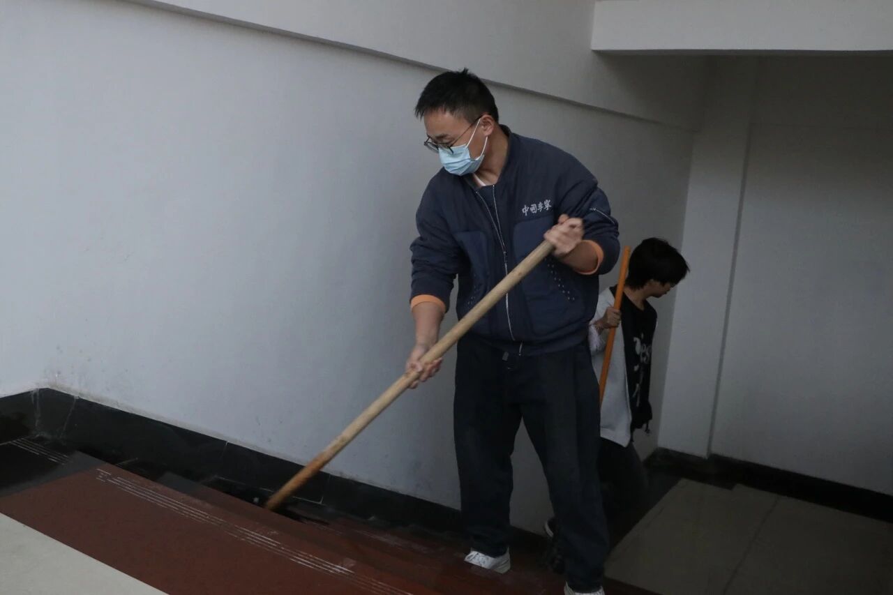 活动采取“分区协作、层层推进”的方式,各部门两两配合,逐层开展细致清扫。从扫地拖地到擦拭扶手、清洁窗户,同学们分工有序,配合默契。在完成本层任务后,一、六层的同学主动驰援中间楼层,形成“上下联动、合力攻坚”的良好氛围,显著提升了整体效率。学院领导老师也加入队伍,弯腰拖地、抬手擦窗,汗水浸湿衣袖,用行动为洁净校园注入温暖力量。