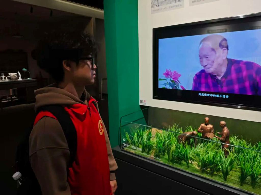 随后,交流团前往隆平水稻文化园及隆平水稻博物馆参观学习。志愿者们跟随讲解,从水稻野生驯化、古代农耕智慧,到现代杂交水稻科研突破,全方位了解“一粒种子改变世界”的传奇。在袁隆平院士事迹展区,“禾下乘凉梦”的愿景与他躬耕田野的奉献故事,让志愿者们深受触动。志愿者纷纷表示,要学习袁隆平院士脚踏实地、攻坚克难的科学精神,将这份坚守与担当融入专业学习和未来职业发展中。