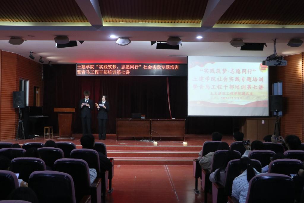为深化青年学子对社会实践的认识,引领学生在服务基层中成长成才,12月11日晚,土建学院于东校区第一实验楼五楼报告厅举办“实践筑梦,志愿同行”社会实践专题培训暨“青马工程”干部培训第七讲。学院团总支书记罗泽元老师出席本次会议,学院全体院干、25级三大班委、2025级秋季学期入团积极分子参加本次会议。本次会议由土木25104班李禹滴和城规25101班李睿主持。