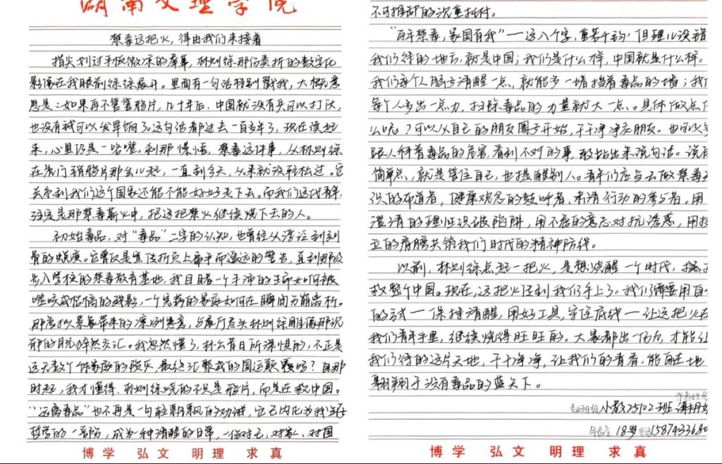 在征文活动中,同学们结合真实案例、禁毒知识与个人思考,揭露毒品对个人、家庭及社会的严重危害,表达对毒品的坚决抵制与对健康生活的向往,彰显了文理学子对毒品危害的深刻理解,对禁毒宣传、禁毒教育的独特见解和共建无毒校园的决心。