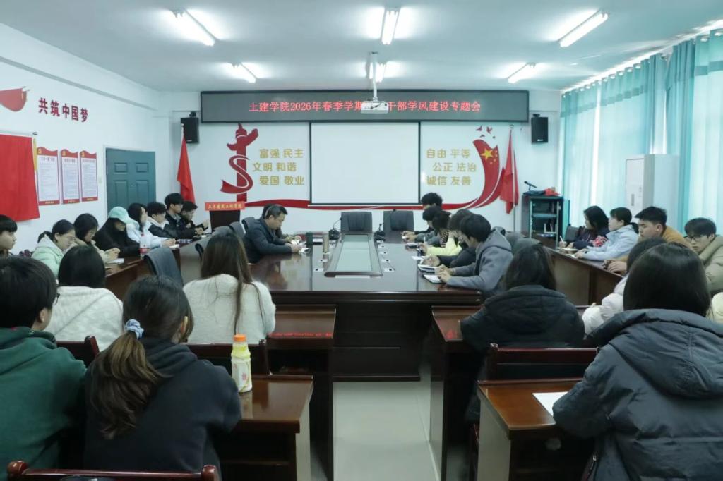为统筹新学期学生工作,强化学生干部队伍建设,抓实抓细学风建设各项工作,3 月 10 日下午,土建学院于土建楼 A318 召开2026年春季学期学生干部第一次会议暨学风建设专题大会。学院党委副书记刘国灿老师、学工办主任黄思清老师、学工办陈倩老师、易烁文老师出席会议,学院主席团及各部门部长、副部长参会,本次会议由黄思清老师主持。