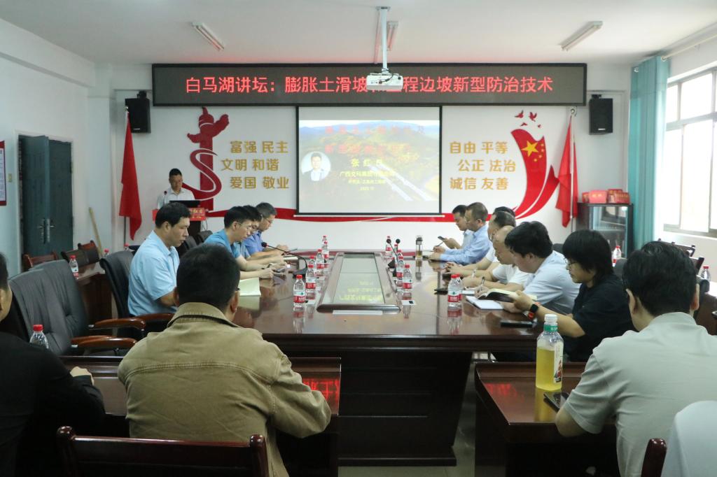 张红日研究员以国家重点研发计划项目(膨胀土滑坡和工程边坡新型防治技术)及省部级科技奖申报为主题作学术报告。报告开篇,他紧扣公路建设实际需求,系统梳理了我国膨胀土边坡的分布规律、易引发的灾害类型,并针对性讲解新型处治技术。从材料创新到施工工艺优化,每一个技术要点都结合工程实例,为在场师生和行业代表提供了可落地的技术参考。其次,张红日研究员对2024年获得的广西科技进步一等奖进行了重点阐述,深刻解析了省部级科技奖的申报流程及申报要点。最后,他结合湖南文理学院“应用型办学”定位与土建学院学科优势,提出了一套“量身定制”的校企合作方案,并与在座各位老师和各单位成员展开了深度探讨。