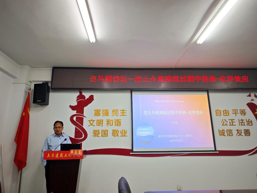 3月24日,南华大学资源环境与安全工程学院院长、博士生导师韦昌富教授就其最新研究成果做了题为《岩土介质渗流过程中的热-化学效应》的学术报告。该研究针对岩土工程中的核心基础问题,提出了创新的理论模型,对保障高放废物地质处置、油气开采与地下储存等国家重大工程的安全具有重要科学价值。学术报告会由土木建筑工程学院院长覃永晖主持。土建学院部分师生参加学术交流。