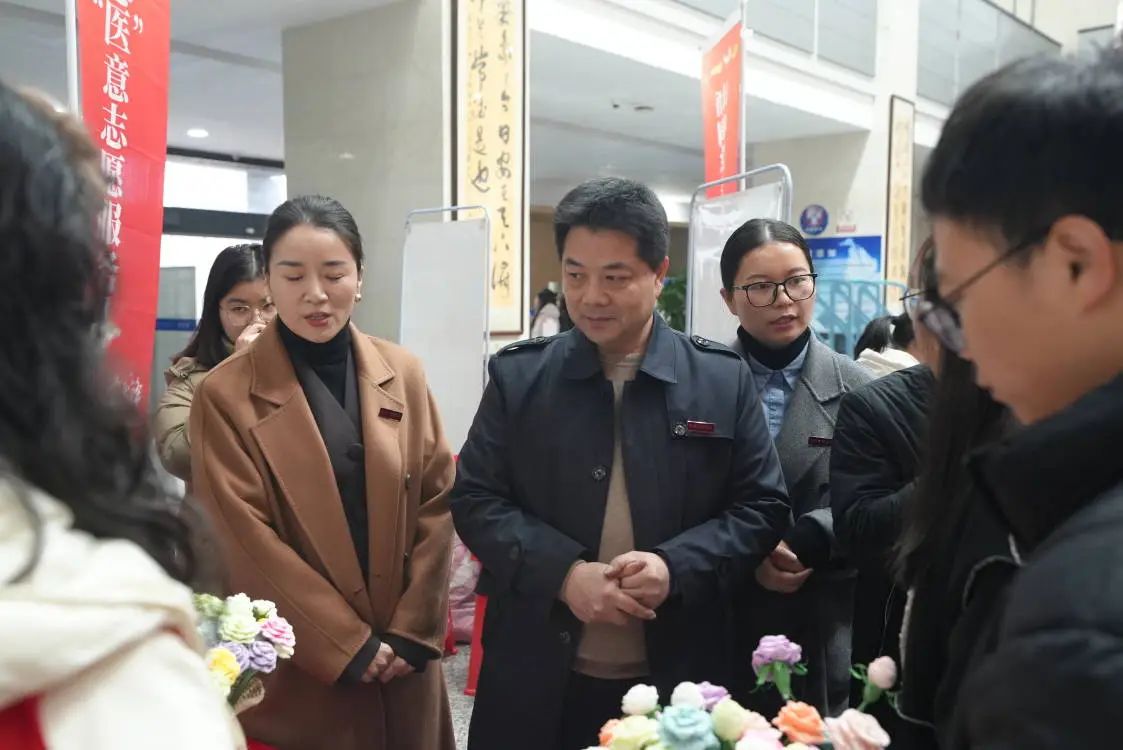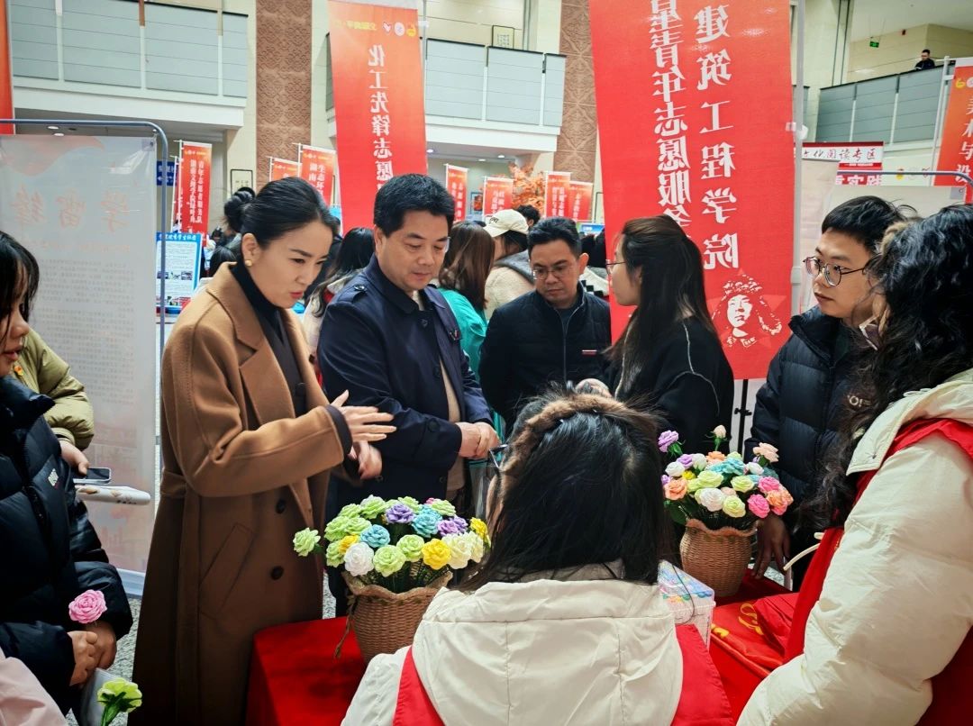 一剪一折,一缠一绕,志愿者将彩纸、丝带与麻绳化作栩栩如生的手工花朵。每一朵花都承载着制作者的专注与心意,让指尖的巧思化作永恒的温暖。在志愿者的指导下,大家捡拾春日里的落花与新叶,通过敲拓染工艺将自然的纹路与色彩永久定格在手帕上。木槌的敲击声此起彼伏,植物的汁液悄然渗透纤维,留下一幅幅独一无二的“自然画作”。这些小活动不仅传递环保理念,还让更多人感受“变废为宝”的创意与善意。
