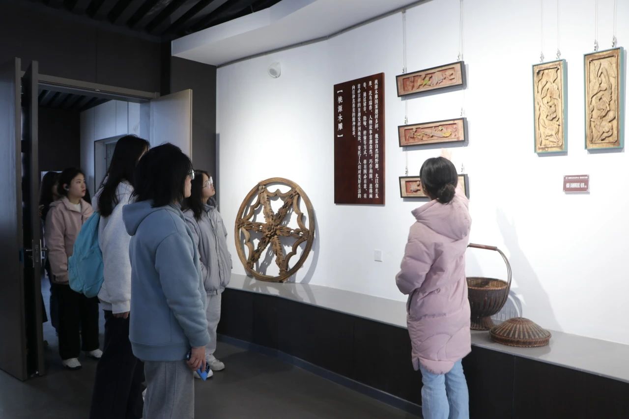 接着,来到民俗文化展馆,刀锋下的桃源木雕,银月流光中的苗族头饰,指尖织就的桃源刺绣,金石之声的古法拓印,流转千年的木雕纹样与银饰图腾,则如文明基因的活化石,于飞针走线、金石拓印间唤醒同学们的文化自信。