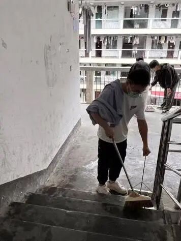 接着,学生按分工推进任务。地面清洁组清扫台阶与平台,扶手养护组协作擦拭,消防设施组擦拭消防箱并检查器材,死角攻坚组清理转角、窗槽等盲区。非团员入党积极分子主动运水、支援其他小组。路过的同学受到感染,纷纷表示会注重维护公共区域整洁。