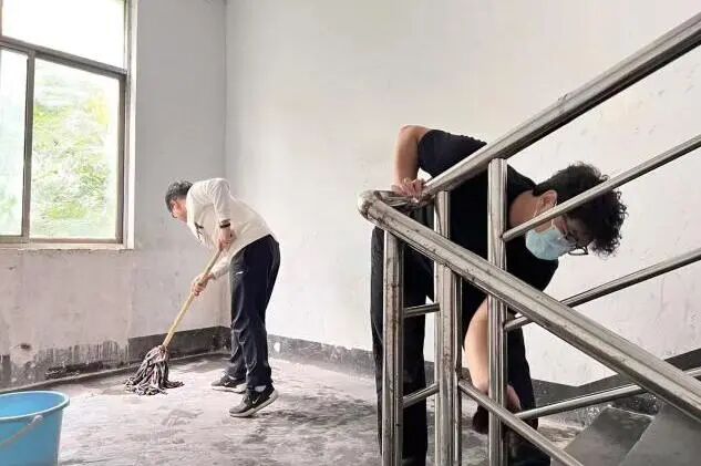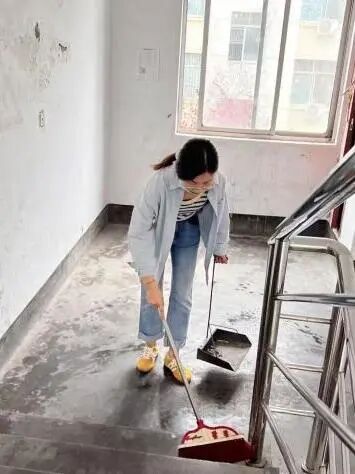 首先,两位老师率先示范明确清洁标准。易烁文老师清理1号楼梯间扶手,先除尘再用清洁剂擦拭,以小毛刷清理积灰;陈倩老师处理 2 号楼梯间台阶,用小铲子清除杂物后逐级拖拭,为学生后续工作提供清晰指引。