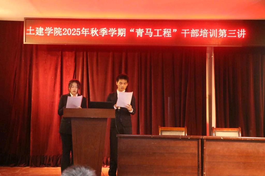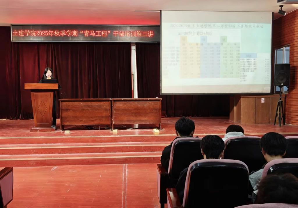 为帮助学生干部系统了解第二课堂制度,掌握到梦空间系统操作流程,11月6日晚,土建学院于东校区第一实验楼五楼报告厅举办2025年秋季学期“青马工程”干部培训第三讲。学院党委副书记刘国灿老师、学工办主任黄思清老师、团总支书记罗泽元老师出席本次会议,学院全体院干、25级三大班委、2025级秋季学期入团积极分子参加本次会议。本次会议由城规25102班颜好、土木25102班李禹滴主持。