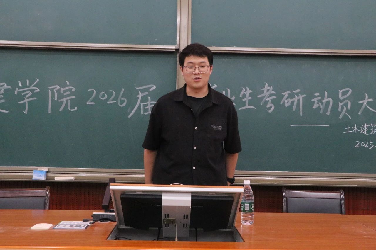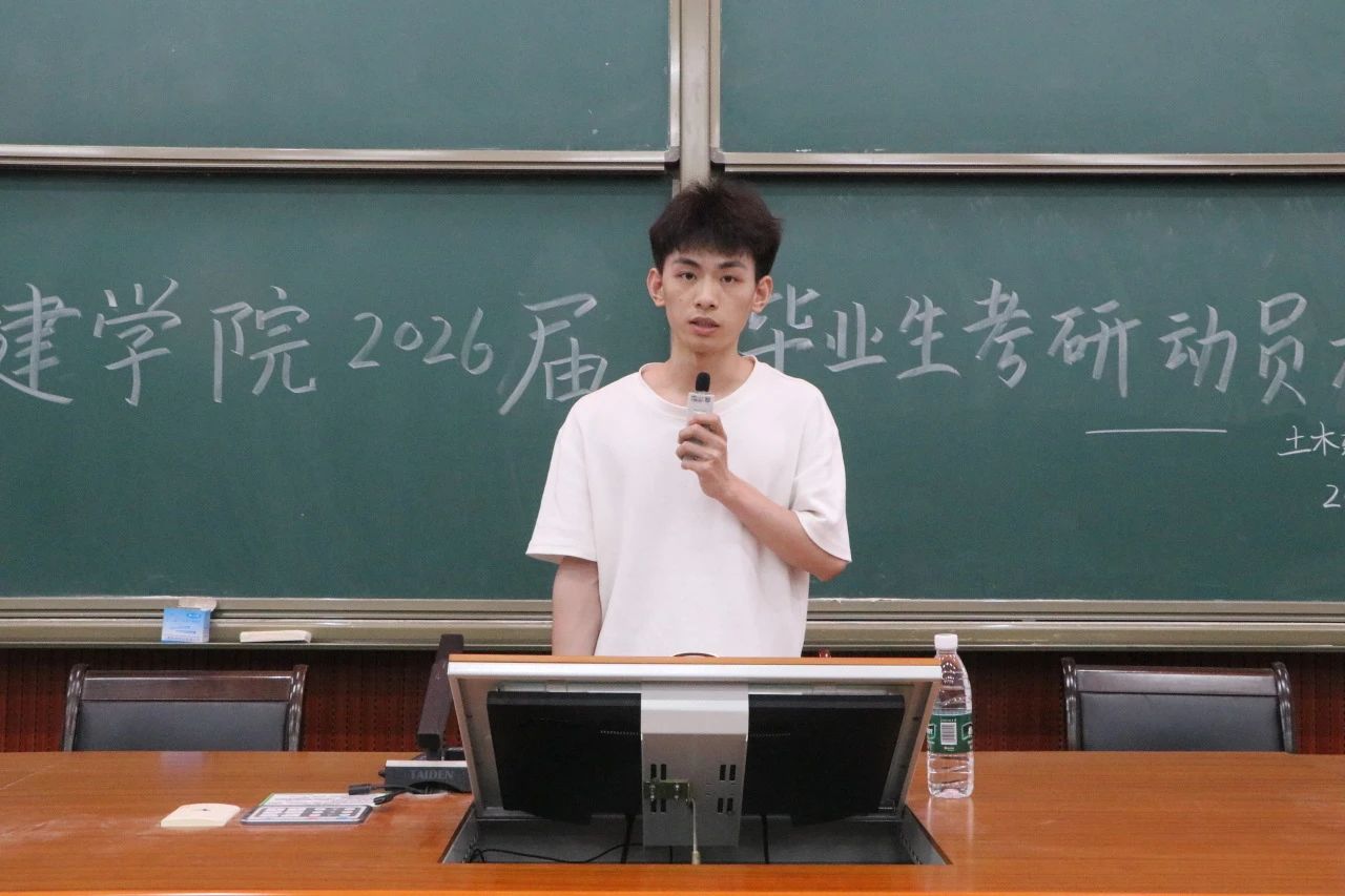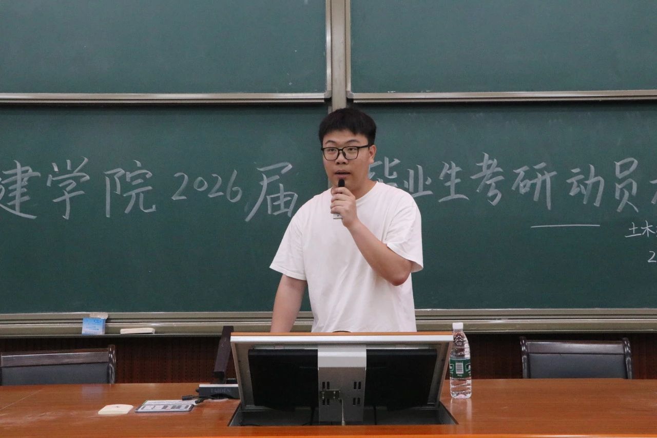 其次,覃永晖院长首先对2025届考研成功上岸的同学们表示祝贺,希望他们在新的学习环境中,继续保持积极进取的态度,不断追求卓越,未来成为行业的中流砥柱,书写属于自己的辉煌篇章。他表示,青年学生进一步提升学历、提高个人的学识水平和能力是顺应时代发展的正确方向,希望同学们认真备考,做好万全准备,在各学科交叉融合和人工智能迅速发展的背景下努力提升自己,用全新的眼光视角和充分的思想准备去迎接新的挑战。同时覃永晖院长提出三点要求:一要有远大的目标,立志在自己热爱的研究方向深耕细作,推动行业的进步与变革。二要脚踏实地去实现,量体裁衣地做出择校决定,一步一个脚印地积累知识,合理安排时间,保持良好的状态,以饱满的热情迎接挑战。三要注重学习方法的精准高效。要尽早制定合理的复习计划,明确学习目标和任务,循序渐进、稳扎稳打。他表示,土建学院永远是同学们坚强的后盾和温暖的家,希望同学们坚定信心,凭借着你们的努力和坚持,相信你们一定能取得优异的成绩,实现自己的理想,为自己展现青春风采,为学院学校争光添彩。