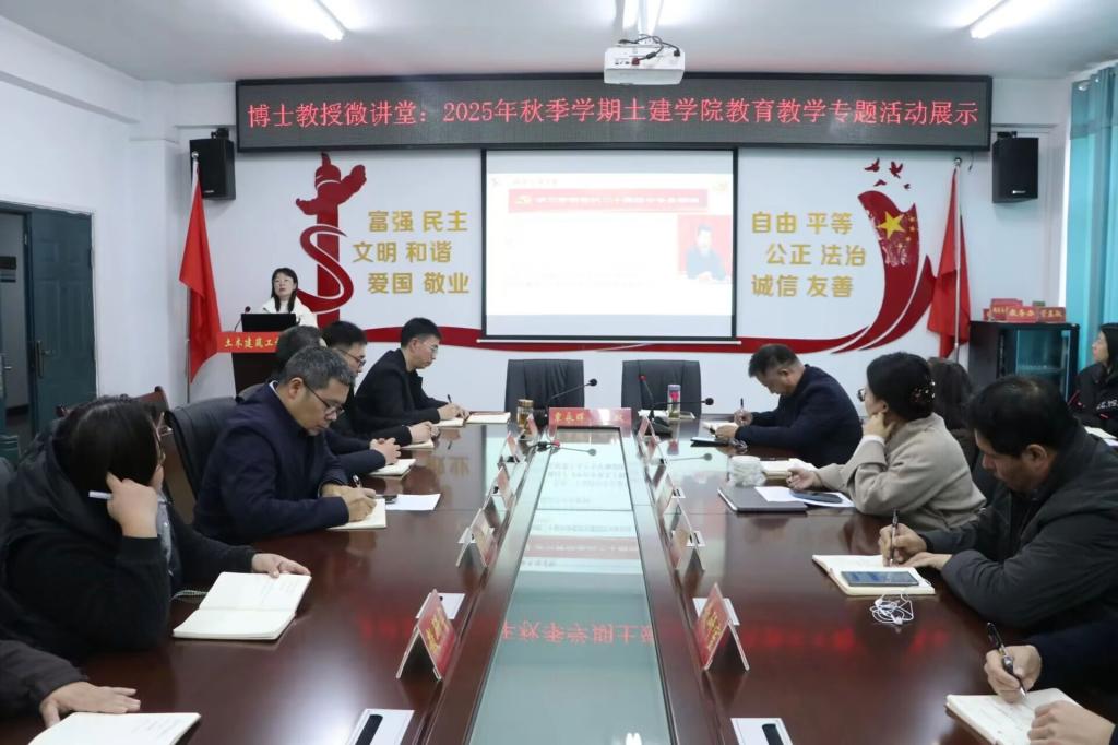 为深入学习贯彻党的二十届四中全会精神,深刻把握“十五五”规划建议内涵,制定好本学院“十五五”规划建设纲要,提升学院教育教学水平,11月18日下午,土建学院于土建楼A318会议室开展党的二十届四中全会宣讲暨秋季学期教育教学专题展示活动。学院全体教职工参加会议,本次会议由学院党委书记刘双主持。