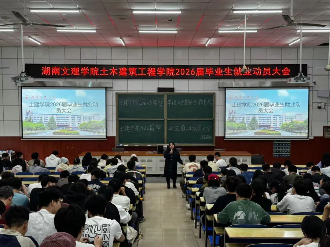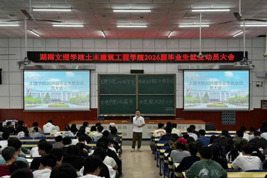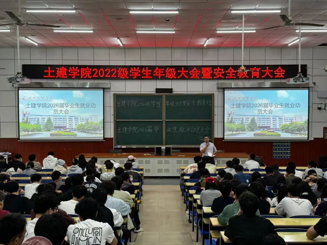 为强化学生安全防范意识,有序推进2026届毕业生就业工作,10月15日中午,土建学院于第三教学楼D301教室召开2026届毕业生就业动员大会暨安全教育大会。学院土木工程系主任曾国良老师、规划与景园系主任管益敏老师、学工办易烁文老师出席了本次会议,2022级全体学生参加了本次会议。本次会议由易烁文老师主持。